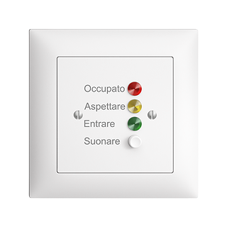 Stazione da porta per segnali di chiamata • Con pulsante e cicalino • Indicazione con LED rosso, giallo e verde • Con morsetti a vite • Iscrizione italiana • Profondità 20 mm • FMI • bianco • IP20