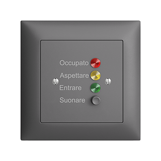 Stazione da porta per segnali di chiamata • Con pulsante e cicalino • Indicazione con LED rosso, giallo e verde • Con morsetti a vite • Iscrizione italiana • Profondità 20 mm • FMI • grigio scuro • IP20