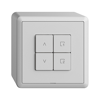 Interruttore per tapparelle Wiser 1 canale scena • 2 contatti di commutazione, 2 A ciascuno, 230 V AC • Per 1 azionamento fino a 460 VA con pulsante di fine corsa (tapparelle, rolladen, tenda,) • Il tasto per scena consente di salvare e richiamare scene • Con morsetti a innesto • Illuminato con LED integrato • 4 tasti • Altezza 54 mm • FX.54 • grigio chiaro • IP20 • 74 x 74 mm