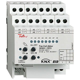 Attuatore FanCoil • Tensione di commutazione 230 V AC • Capacità di commutazione AC1 10 A, AC3 10 A • Corrente di inserimento mass. 800 A 200 μs, 165 A 20 ms • Corrente di commutazione min. 100 mA • Con azionamento manuale • Con morsetti a vite • REG • IP20 • 4 moduli • 230 V AC, 50 Hz