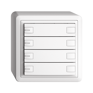 EDIZIOdue colore • Pulsante UNI • Interfaccia seriale, con protocollo • 5 V DC • Collegamento ad innesto • Con LED rosso, verde, blu • Tasto quadruplo • Comando a 2 tasti • Altezza 59 mm • FX.54 • bianco • IP20 • 74 x 74 mm