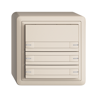 EDIZIOdue colore • Pulsante UNI • Interfaccia seriale, con protocollo • 5 V DC • Collegamento ad innesto • Con LED rosso, verde, blu • Con targhetta • Tasto sestuplo • Comando a 1 tasto • Altezza 59 mm • FX.54 • crema • IP20 • 74 x 74 mm