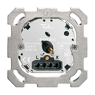 Variatore universale rotativo • Illuminato • 230 V AC, 50 Hz • Per lampade ad incandescenza e lampade alogene a bassa tensione • Per trasformatore elettronico • Per trasformatori convenzionali • La combinazione di trasformatori elettronici e convenzionali in esercizio a carico misto non è possibile • Luminosità minima e massima regolabile • Con contatto di commutazione per circuito d'inversione • Con LED giallo 1,0 mA • 20-600 W ohmnico, 20-600 VA induttivo/capattitvo • Profondità 29 mm • BSM • incolore • IP20 • 77 x 77 mm