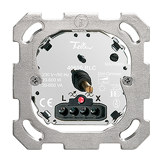 Variatore universale rotativo • Illuminato • 230 V AC, 50 Hz • Per lampade ad incandescenza e lampade alogene a bassa tensione • Per trasformatore elettronico • Per trasformatori convenzionali • La combinazione di trasformatori elettronici e convenzionali in esercizio a carico misto non è possibile • Luminosità minima e massima regolabile • Con contatto di commutazione per circuito d'inversione • Con LED rosso 1,0 mA • 20-600 W ohmnico, 20-600 VA induttivo/capattitvo • Profondità 29 mm • BSM • incolore • IP20 • 77 x 77 mm