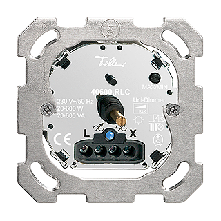 Variatore universale rotativo • Illuminato • 230 V AC, 50 Hz • Per lampade ad incandescenza e lampade alogene a bassa tensione • Per trasformatore elettronico • Per trasformatori convenzionali • La combinazione di trasformatori elettronici e convenzionali in esercizio a carico misto non è possibile • Luminosità minima e massima regolabile • Con contatto di commutazione per circuito d'inversione • Con LED blu 1,0 mA • 20-600 W ohmnico, 20-600 VA induttivo/capattitvo • Profondità 29 mm • BSM • incolore • IP20 • 77 x 77 mm