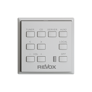 Wandbedienung • Bedienung der Anlage mittels 10 Tasten • blaue Bestätigungs-LED • Quellenwahl, Lautstärke, Ein-/Aus, Vor-/Zurück • IR-Empfänger für REVOX-Fernbedienungen • Einbautiefe 20 mm • F • hellgrau • IP20 • 60 x 60 mm
