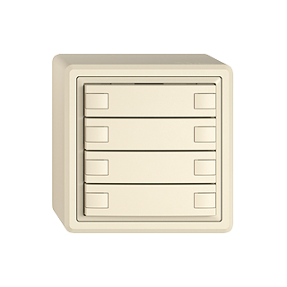 EDIZIO.liv • Pulsante KNX RGB • 21-30 V DC SELV • Fabbisogno di base mass. 250 mW • Morsetto di collegamento bus KNX • Con accoppiatore bus KNX Secure • Consiste in unità funzionale con fino a otto possibili assegnazioni di tasti • Con sensore temperatura • Sistema de fissagio SNAPFIX® • Senza LED • Tasto ottuplo • Comando a 1 tasto • Altezza 44 mm • GX.54.A • crema • IP20 • 74 x 74 mm