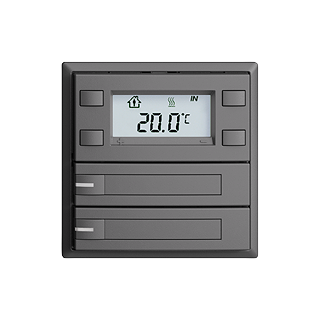 EDIZIOdue colore • KNX-RTH-Taster RGB • 21-30 V DC SELV • Grundbedarf max. 250 mW • Zusätzliche Leistung pro LED max. 30 mW • Zusätzlich für LCD Hintergrundbeleuchtung max. 200 mW • KNX-Busanschlussklemme • Mit BCU • KNX-Geräte mit der Zusatzbezeichnung RGB können ausschliesslich mit der zugehörigen Applikation mit der Zusatzbezeichnung RGB programmiert werden. • Mit RGB-LED rot, grün, blau, weiss, gelb, volett, und 2 frei definierbaren Anwenderfarben • Mit Papiereinlage • Zweifach-Taste • 1-Tastenbedienung • Einbautiefe 22 mm • F • dunkelgrau • IP20 • 60 x 60 mm