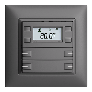 EDIZIOdue colore • Pulsante RTH KNX RGB • 21-30 V DC SELV • Fabbisogno di base mass. 250 mW • Potenza supplementare per ogni LED mass. 30 mW • In aggiunta per retroilluminazione LCD mass. 200 mW • Morsetto di collegamento bus KNX • Con BCU • Gli apparecchi KNX con designazione supplementare RGB possono essere programmati esclusivamente con la rispettiva applicazione riportante la designazione RGB. • Con RGB LED rosso, verde, blu, bianco, giallo, vialo e 2 colori liberamente definibili dall'utente • Tasto quadruplo • Comando a 1 tasto • Profondità 22 mm • FMI • grigio scuro • IP20 • 88 x 88 mm