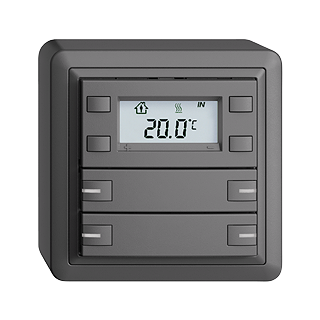 EDIZIOdue colore • Pulsante RTH KNX RGB • 21-30 V DC SELV • Fabbisogno di base mass. 250 mW • Potenza supplementare per ogni LED mass. 30 mW • In aggiunta per retroilluminazione LCD mass. 200 mW • Morsetto di collegamento bus KNX • Con BCU • Gli apparecchi KNX con designazione supplementare RGB possono essere programmati esclusivamente con la rispettiva applicazione riportante la designazione RGB. • Con RGB LED rosso, verde, blu, bianco, giallo, vialo e 2 colori liberamente definibili dall'utente • Tasto quadruplo • Comando a 1 tasto • Altezza 44 mm • FX.39 • grigio scuro • IP20 • 74 x 74 mm