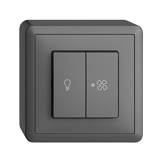Interruttore per luce e ventilatore • Illuminato • 16 A, 230 V AC • Con morsetti a innesto • Carico LED max: 200 W • Deviatore/deviatore • 3/3/1 L • Con LED giallo 1,0 mA • Illuminazione di controllo per ventilatore • Altezza 44 mm • FX.39 • grigio scuro • IP20 • 74 x 74 mm