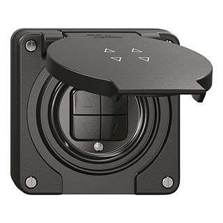 Storenschalter 2-Kanal • 10 A, 250 V AC • Mit 4 Tasten • Mit Steckklemmen • Frontscheibe 53 mm, für Bohrung 53 mm • Minimale Umschaltzeit (AUF/AB) <500 ms möglich • Einbautiefe 18 mm • NUP.Q • schwarz • IP55 • 87 x 87 mm