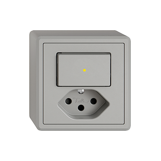 EDIZIO.liv • Kleinkombination • Beleuchtet • Mit Frontlinse • Mit Drucktaster und Steckdose Typ 13 • 10 A, 250 V AC, L + N + PE • Mit Steckklemmen • Schliesser-Öffner • 1 L • Mit Shutter • Mit LED Gelb 1,0 mA • Orientierungsbeleuchtung • SNAPFIX® Befestigungssystem • Anbauhöhe 58 mm • GX.54.A • hellgrau • IP20 • 74 x 74 mm