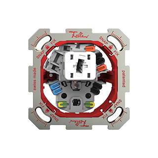 Il sistema di fissaggio in due fasi Feller SNAPFIX® riduce il lavoro di progettazione, ordinazione e installazione grazie a un ritaglio unitario simmetrico nella placca di fissaggio e all'adattatore rosso sull'unità funzionale. Quest'ultimo viene inserito a scatto (SNAP) nella placca di fissaggio e poi i quattro fermi agli angoli vengono fissati (FIX) in posizione con il cacciavite n.2. Feller SNAPFIX® ha un design modulare ed è adatto a tutte le funzioni Feller.