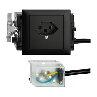 Presa semplice tipo 23 • 16 A, 250 V AC, L + N + PE • Con morsetti a vite • Raccordo su L3 • Con scatola ad incasso • Con fissaggio SNAP per guida DIN 35 mm • Altezza di montaggio 53 mm • FKE53.SN • nero • IP20 • 80 x 130 mm • Con adattatore per cavo Ecobus power