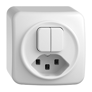 Piccola combinazione • Non illuminato • Con interruttore doppio e presa tipo 23 • 16 A, 250 V AC, L + N + PE • Con morsetti a innesto • Carico LED max: 200 W • Disco frontale 60 mm, per ritaglio 58 mm • Serie, invertitore-invertitore • 1/3+3/1 L • Per schema 3+3 togliere il collegamento standard • Altezza 58 mm • QX.54 • bianco • IP20 • 76 x 76 mm