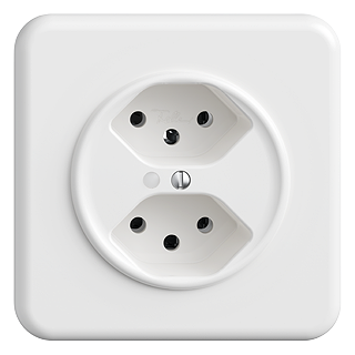 STANDARDdue (SNAPFIX) • Presa doppia tipo 13 • Illuminato • 10 A, 250 V AC, L + N + PE • Con morsetti a innesto • Illuminazione d'orientamento / indicatore di tensione • Con LED verde 1,0 mA • Disco frontale 60 mm, per ritaglio 58 mm • Parallela • senza tubi luminosi • Sistema de fissagio SNAPFIX® • Profondità 40 mm • QMI.A • bianco • IP20 • 90 x 90 mm