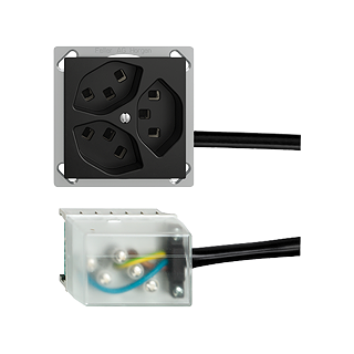 Dreifach-Steckdose Typ 23 • 16 A, 250 V AC, L + N + PE • Anschluss auf L1 • Parallel • Mit Einlasskasten • Einbautiefe 41 mm • FMTE • schwarz • IP20 • 70 x 70 mm • Mit Kabelanschlussadapter Ecobus power
