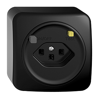 Fehlerstrom-Schutzsteckdose Typ 23 • 16 A, 250 V AC, L + N + PE • Auslösestrom 30 mA • Mit Anschlussklemmen für weitere Steckdosen • Frontscheibe 60 mm, für Bohrung 58 mm • Anbauhöhe 64 mm • QX.54 • schwarz • IP20 • 76 x 76 mm