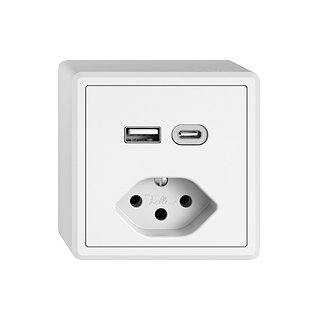 EDIZIO.liv • Combinazione USB A+C/T13 • 230 V AC • Corrente in uscita mass. 1 x 3000 mA oder 2 x 1500 mA • Possono collegare in parallelo fino a 2 apparecchi • Potenza assorbita (stand-by) mass. 100 mW • Protenzione contro il sovraccarico e resistenti ai cortocircuiti • 2 attacci USB tipo A e tipo C • Tensione in uscita 5 V DC ±5 % • Con morsetti a innesto • Sistema de fissagio SNAPFIX® • Altezza 55 mm • GX.54.A • bianco • IP20 • 74 x 74 mm