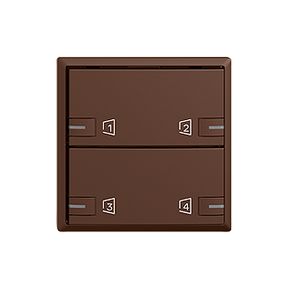 Abdeckset zeptrionAIR • Die Smart-Tasten ermöglichen die Bedienung von 4 zeptrionAIR Szenen per WLAN • Das zeptrionAIR Abdeckset wird auf das zeptrion WLAN-Zwischenmodul 2K (3340-2-B.ZEP) und auf den Zentral-/Nebenstellen Funktionseinsatz 3320 montiert • Mit RGB-LED • Zweifach-Taste • 2fach-Bedienung • zeptrionAIR Szene auf 4 Smart-Tasten • F • coffee • IP20 • 60 x 60 mm